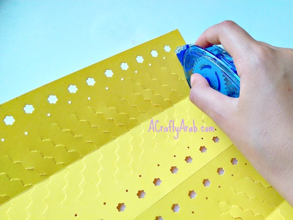 Open your paper and run a line of double sided tape all along one end. Bring over your other side, creating a cylinder shape.