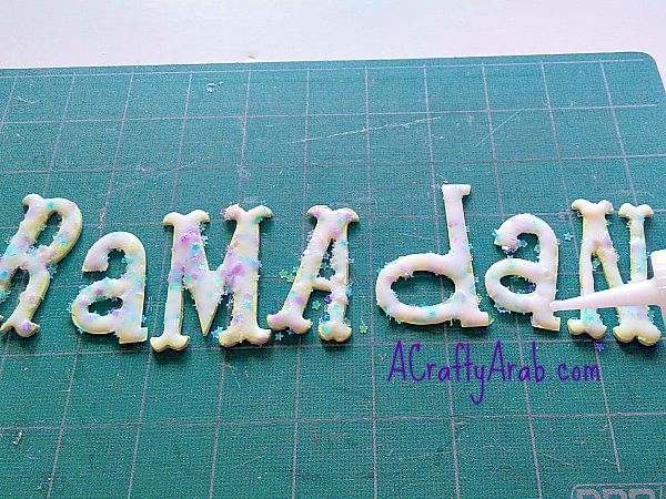 Once the glitter has sat for an hour or so to set, we moved the letters to our cutting mat and added a layer of diamond glaze. We were able to pick up the file folder of glitter and fold it in half to throw away, no mess!